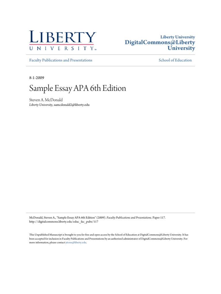 APA Sample Student Paper APA Sample Professional Paper This resource is enhanced by Acrobat PDF files. 2 Sample Essay APA 6th Edition - Liberty University Sample Essay. APA Writing Guide - Liberty University.